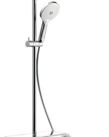 Duravit Shower Systems Brusesystem MinusFlow med hylde, Krom|Hvid højglans 400x524x940 mm, Termostatpatron, sikkerhedslås ved 38°C, mål 150 mm ± 15 mm, slangetilslutning DN15, flow 9,0 l/min (3bar), vinkeljusterbar hovedbruser, drejbar brusearm, højdejusterbar håndbruseholder, anbefalet betjening tryk 1 - 5 bar, inkluderet i leveringsomfanget: bruseslange 1600 mm, håndbruser 3 Jet Click! Ø 120 mm MinusFlow, hovedbruser 1 stråle Ø 230 mm MinusFlow,Før pris: 5.696,25 kr. Inkl. moms -